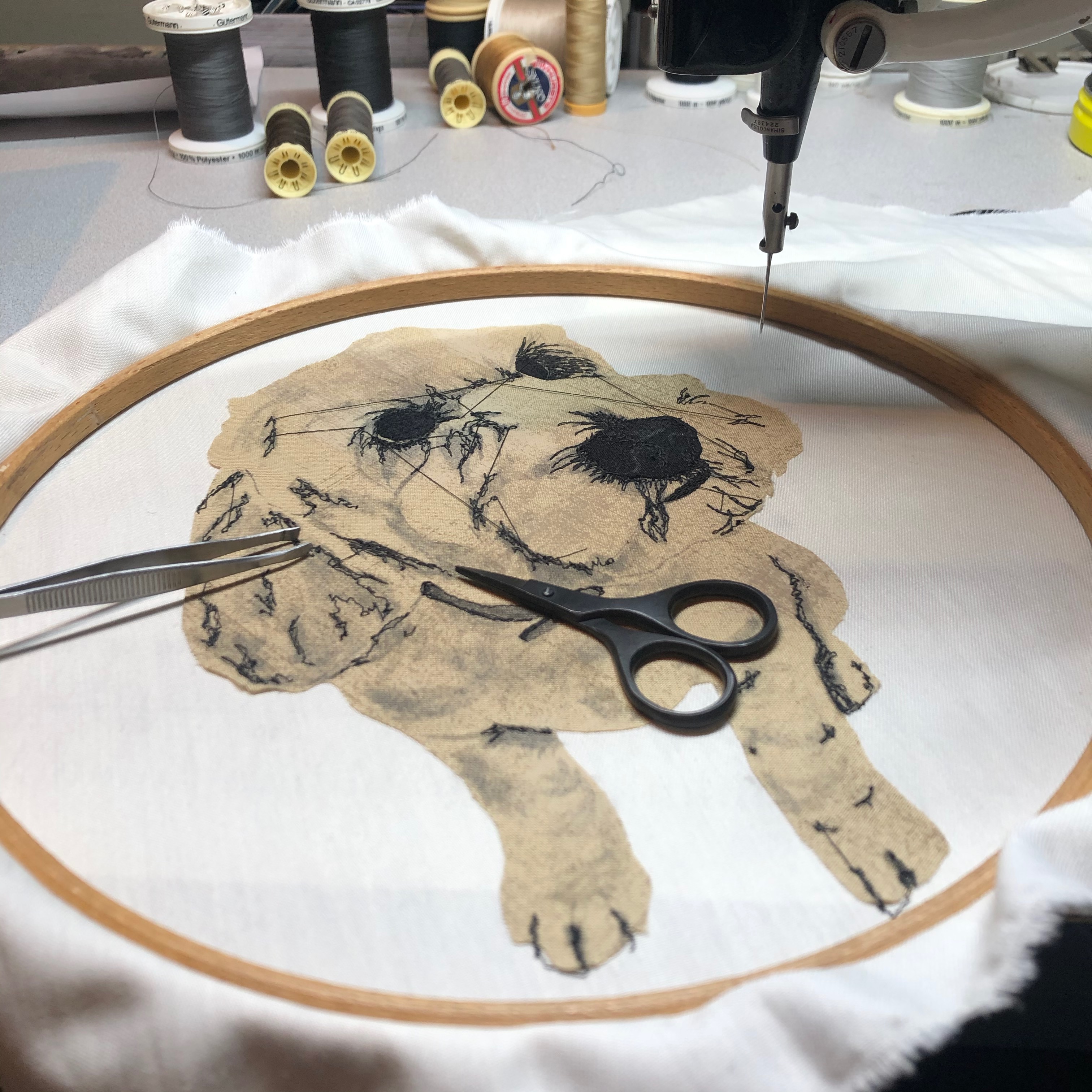 In case you haven’t come across it before, freestyle-machine embroidery is embroidery done on a sewing machine. That’s it. It’s not a computer-generated image, my machine is an old Singer from the 1950s, so there’s nothing digital about it – it’s just me, “drawing” with a sewing machine. Imagine drawing, but with a fixed pen, so the pen stays put, and you have to move the paper around underneath it to make the drawing. That’s what I do, but with a sewing machine. It’s faster, noisier, and potentially, a lot more dangerous, but exciting and inspiring.