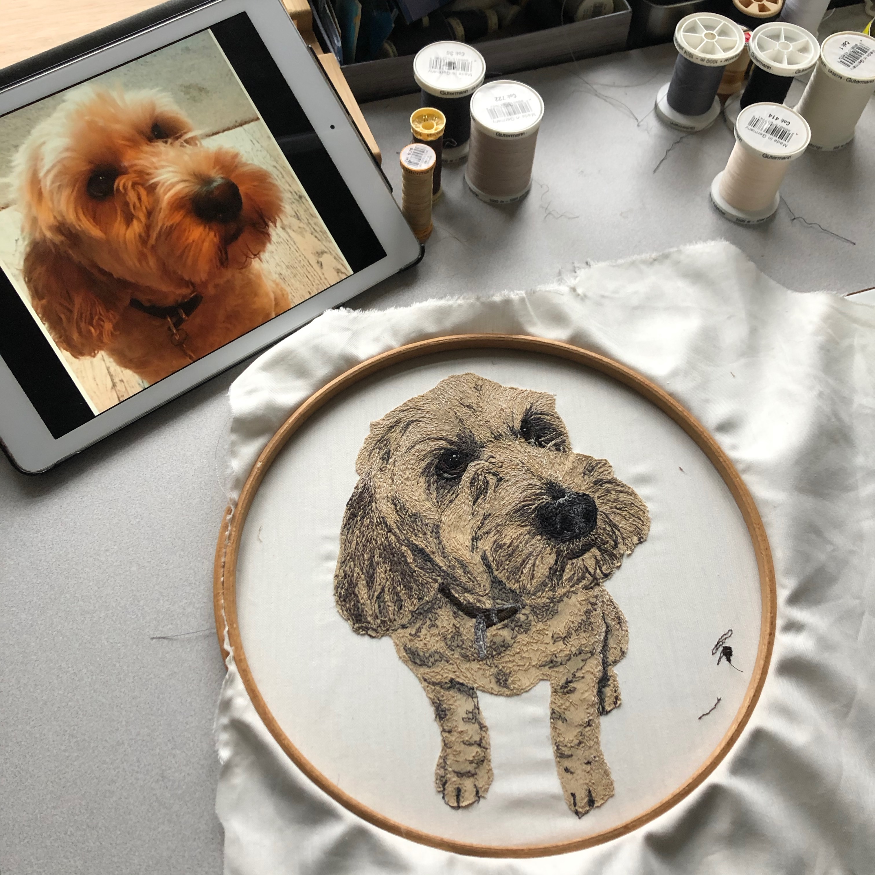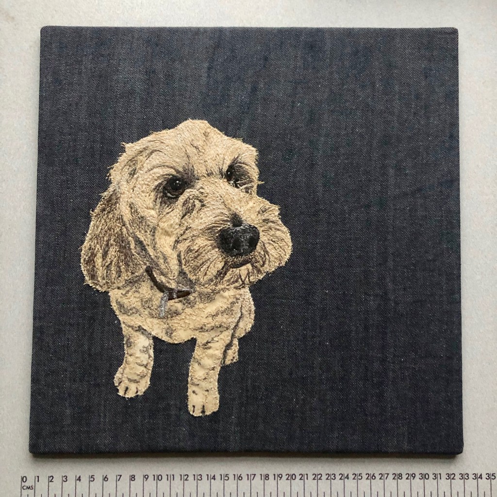 Some people call it threadsketching or threadpainting, which captures what it is that makes this art so … would I say, quirky? Perhaps, unusual, certainly, and I think, so special. It’s the combination of the two forms, painting, with threads; a portrait that conveys something precious of the feel of your animal, meaning both the character – the souls of these best beloveds that shine out through the tiny hand stitched highlights in the eye – and the feeling, literally the touch, the tactile, soft, scruffy, tangled, silky, smooth, furry wonder of them. The stitches, in colour, direction, length, and it has to be said, multitude, of them, “feels” like your animal. I’m not suggesting you stroke these portraits (and they mostly do end up behind glass, not that they have to – I send them out unframed, but I’m happy to talk you through your many options in framing), but as there is a difference between a photograph and a painting, so there is between a painting and a threadpainting. You just have to stand in front of one one day and you’ll see.